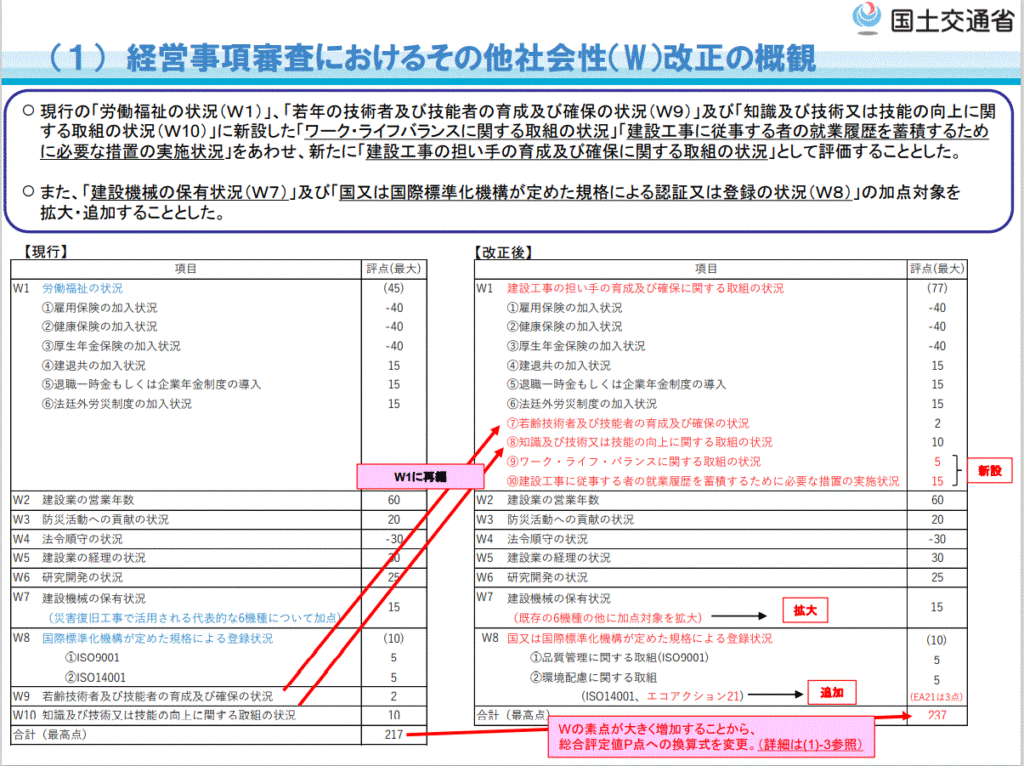 今回の改正では、その他社会性(W点)の部分が改正されます。下図の通り、項目はW1~W8にまとめられ、一部項目の新設や拡大、追加がなされました